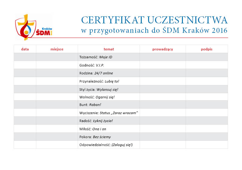 - Otrzymasz Certyfikat Uczestnictwa w przygotowaniach do ŚDM Kraków 2016, który będzie cenną pamiątką duchowej drogi na ŚDM.